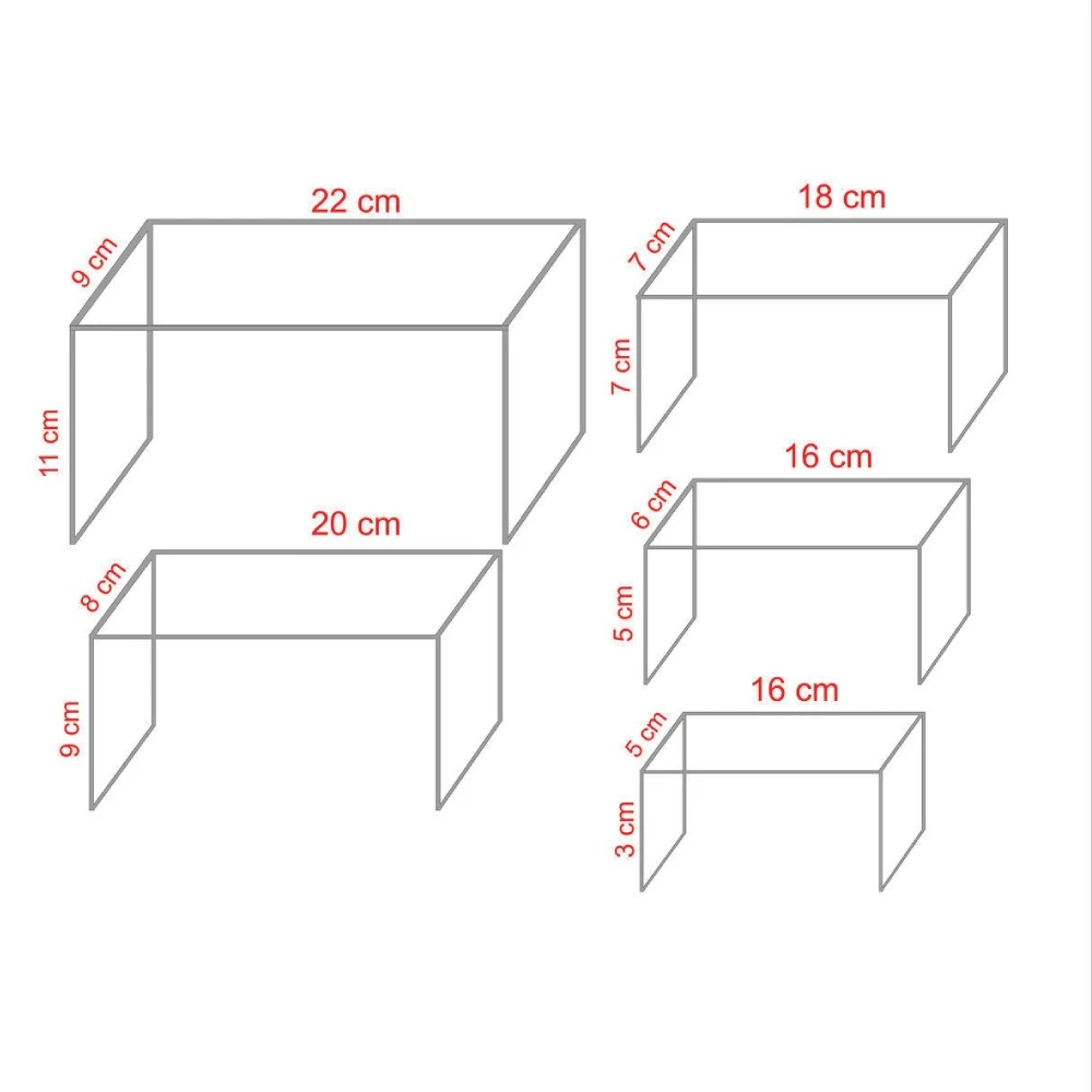5 Set Şeffaf Pleksi Sergileme Standı, farklı boyutlardaki 5 ayrı standdan oluşan, profesyonel ve düzenli sunumlar için ideal bir sergileme çözümüdür. Şeffaf pleksi malzemesi ile modern ve sade bir görünüm sunarken, ürünlerinize odaklanmayı sağlar.